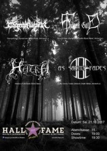 Die Chancen auf einen ohrenbetäubenden Samstagabend in Wetzikon stehen ziemlich gut. Heute sind nämlich Frozen Gate, Irony Of Fate, Hedera und As Sanity Fades zu Gast im Hall Of Fame. Ein reiner Schweizer-Event. Das war allerdings nicht immer so. Ursprünglich wären die deutschen Symphonic Black Metaller Totengeflüster als Headliner vorgesehen gewesen. Aufgrund eines Unfalls ihres Drummers mussten die Jungs die anstehenden Gigs leider kurzfristig absagen. Mit Irony Of Fate konnte für heute Abend allerdings ein sicherlich würdiger Ersatz verpflichtet werden.