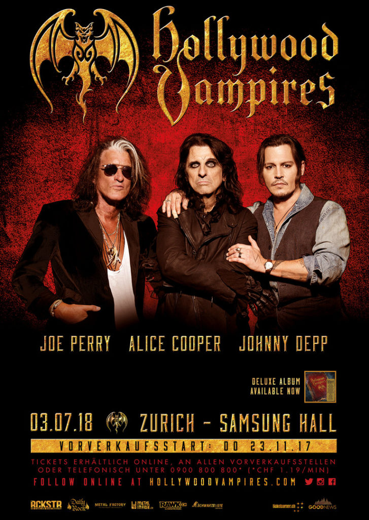 Am 3. Juli 2018 spielen die Hollywood Vampires in der Samsung Hall ihre allererste Schweizer Show. Lasst euch dieses Staraufgebot der Extraklasse nicht entgehen. In Joe Perrys eigenen Worten: Ich wünschte ich wäre im Publikum und könnte zusehen wie wir die Bühne zerstören.
