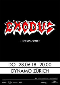 Die Truppe mit Mitgliedern aus Basel, Zürich und Weil am Rhein (D) fackelt nicht lange und sorgt sogleich für Bewegung in den Publikumsreihen. Ihr Mix aus Thrash und Groove Metal stösst auf zahlreiche, dankbare Gehörgänge. Mister Pulver, Pat Müller (Gitarre) und Franky Winkelmann (Bass) sind heute äusserst sprungfreudig und beinahe mehr in der Luft als auf dem Bühnenboden. Für meinen Geschmack dürfte das Mikro des Fronters noch ein bisschen lauter eingestellt sein. Ansonsten gibt’s aber nix zu bemängeln. Meinetwegen dürfte das Quartett auch gerne länger als 45 Minuten spielen. Zum Abschied wünscht uns der Bandleader viel Vergnügen mit Exodus und weiterhin viel Spass mit der Fussball-WM in Russland. Jep, König Fussball regiert noch bis zum 15. Juli die Welt.