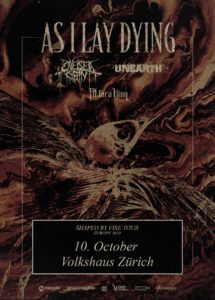 Alle drei Vorgruppen mussten auf einer verkleinerten Bühne ran. As I Lay Dying haben für ihre Darbietung jetzt aber die gesamte «Spielwiese» zur Verfügung. Von Beginn weg geht’s ordentlich zur Sache. Die Herrschaften aus San Diego, Kalifornien lassen den Fuss schön auf dem Gaspedal. Starke Performance! Sonnenschein aus ihrer Heimat haben sie in Form von gelegentlichen Pyro-Effekten mit nach Zürich gebracht. Nicht übel. Ich kann mich ehrlich gesagt gerade nicht daran erinnern, wann ich das letzte Mal Feuer im Volkshaus zu Gesicht bekommen habe.