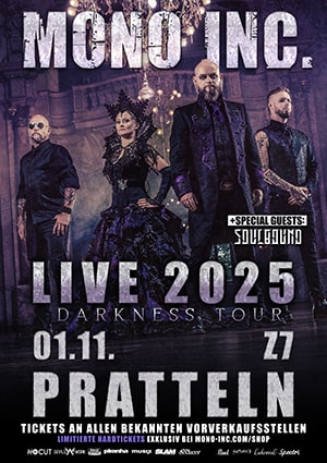 Die folgende Tournee entwickelte sich zum wahren Triumphzug. Und die Daten der „Symphonic Tour 2024“ waren allesamt schon lange im Vorfeld ausverkauft. Nun freuen wir uns auf den 1. November 2025, wenn die Band mit ihrem 13. Studioalbum „Darkness“ (Release: 15. August 25) wieder zu uns ins Z7 kommt, um mit den Schweizer Fans mit alten Hits und brandneuem Material 25 Jahre Mono Inc. zu feiern.