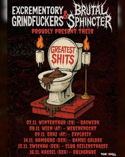 Wer Grindcore mag, kommt am 7. November 2025 im Gaswerk Winterthur auf seine Kosten! Das Konzert von Brutal Sphincter und Excrementory Grindfuckers inklusive Schweizer Support Rectal Depravity verspricht eine grosse Grindcore-Party!