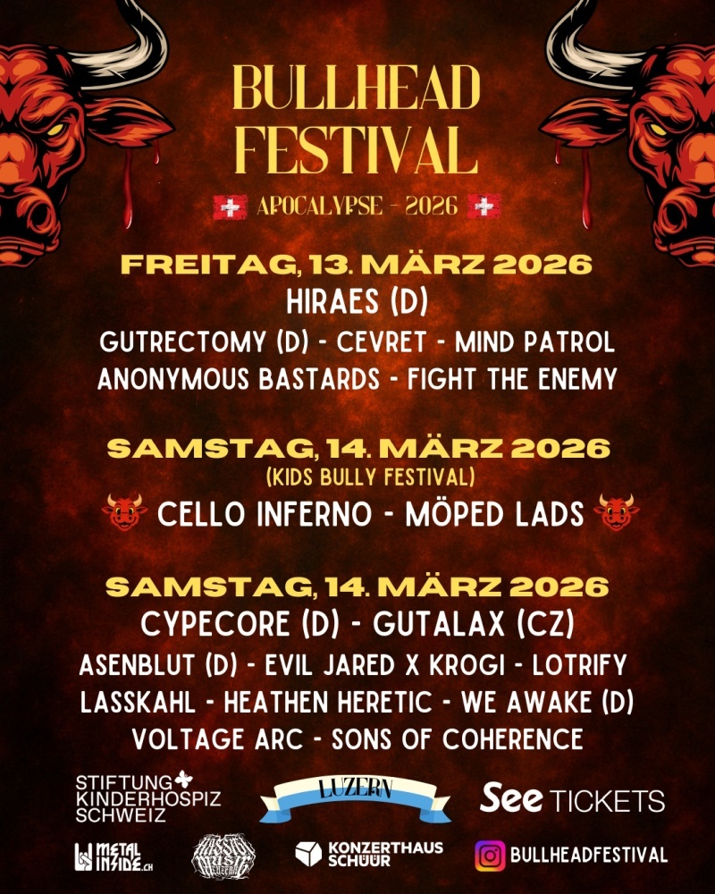 Das Bullhead Festival geht 2026 in die dritte Runde – und es wird härter, dichter und bunter als je zuvor! Am 13. und 14. März 2026 bebt erneut das Konzerthaus Schüür in Luzern, wenn nationale und internationale Metal-, Rock- und Punk-Acts die Bühne stürmen.