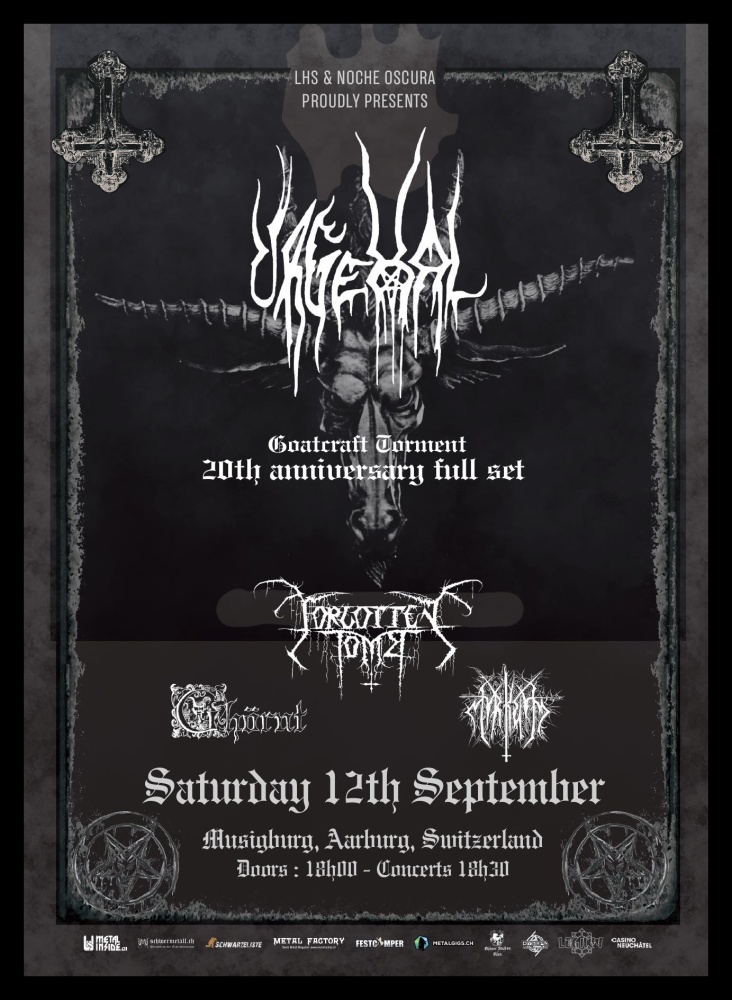 Wenn die norwegische Kälte auf italienische Melancholie trifft, bebt die Musigburg. Am 12. September 2026 versammelt sich die Black-Metal-Elite in Aarburg, um mit Urgehal, Forgotten Tomb, Myrkvid und Ghörnt ein rituelles Fest der Dunkelheit zu feiern. Ein Line-up, das keine Gefangenen macht.